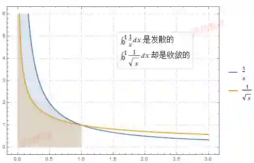 考虑下面两个反常积分, 被积函数非常相似, 在 x=0 点都有垂直渐近线, 但一个是发散而另一个是收敛的, 现在观察图形.