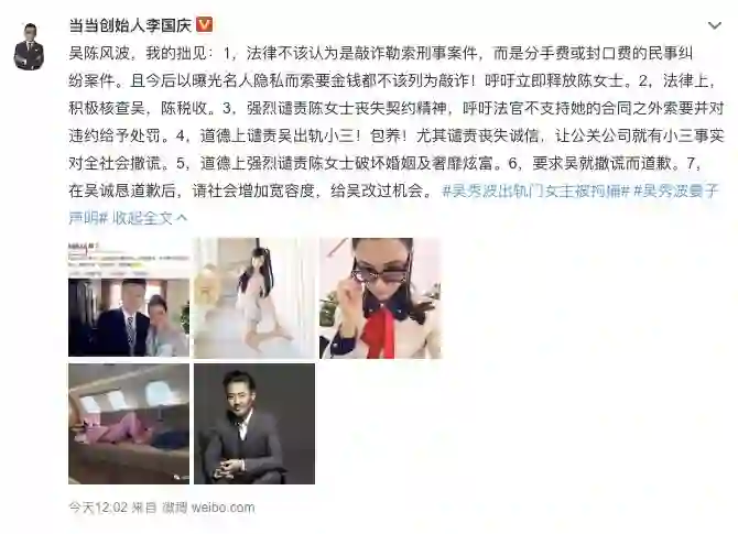 1月22日下午消息,近日陈昱霖与吴秀波的事件闹得沸沸扬扬,当当网创始人李国庆对此在微博发声,呼吁立即释放陈昱霖。他表示,法律不该认为是敲诈勒索刑事案件,而是分手费或封口费的民事纠纷案件。且今后以曝光名人隐私而索要金钱都不该列为敲诈!李国庆还建议,积极核查吴秀波、陈昱霖的税收。(凤凰科技)