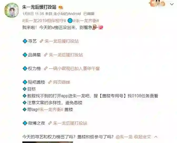 1月8日早上8点49分,@朱一龙后援打投站准时发布了当天的“早安签到贴”,列出了所有当日需要签到的链接,号召粉丝签到。