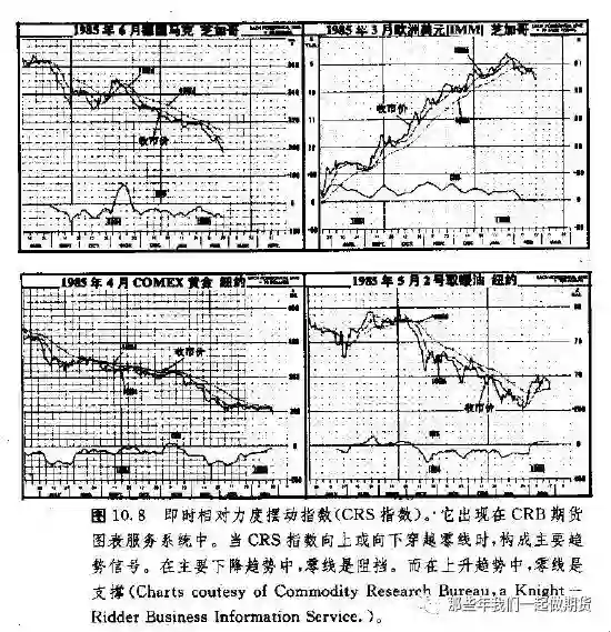 商品研究局CRS摆动指数零线穿越分析最精采的实例。当数“即时相对力度(CRS)摆动指数”。这种指数出现在商品研究局的CRB期货图表服务系统中。在上升趋势中,CRB零线的作用与主要上升趋势线极为类似,起到支撑线的作用。在牛市中,当市场调整时,CRS指数的曲线通常下降到零线,然后,从它上面反弹。在熊市中,当市场上冲时,CRS零线也象主要下降趋势线那样,起到阻挡作用。因此,当CRS指数从上方或下方接近零线时,我们就可以采取相应的措施(见图10.8)。