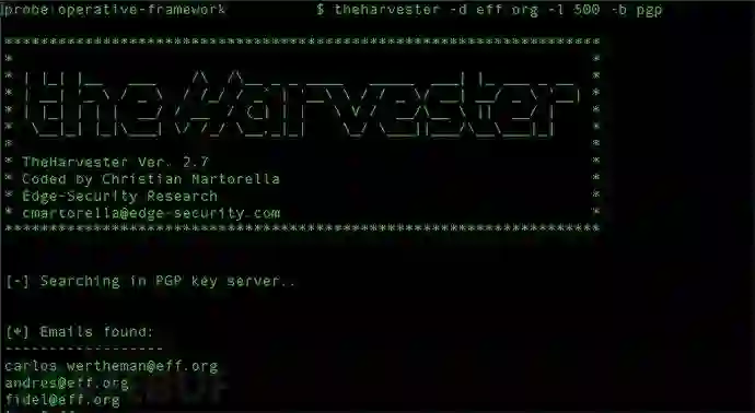 TheHarvester基于Kali,有助于收集域名、电子邮件地址、员工姓名、以及来自SHODAN的信息等。