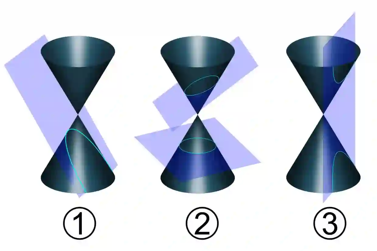 两个倒立的圆锥,顶对着顶放置。用一个平面去切割它们,三维物体在这个平面上留下的曲线,我们叫做圆锥曲线。当曲面切的方向不同也就可以形成不同的圆锥曲线,有圆形,有抛物线,有双曲线,有椭圆。