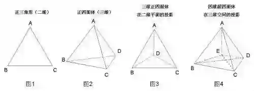 同理,如果有第五个点能和这个三维的正四面体距离都是1,那么这个点也一定存在于四维空间中,与三维的正四面体一起构成四维的超四面体。