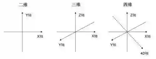 在二维的空间中,两条垂直相交的直线,可以构成 X 轴和 Y 轴。在三维的空间中,三条相互垂直相交的指向,构成了 X 轴,Y轴和 Z 轴。第三条直线穿过二维空间中交点(即原点),并且垂直于二维空间。同理,在四维空间中,同样会有一条直线,穿过这三维空间的三条直线的交叉点(三维坐标轴的原点),并垂直于前面三条直线。四维空间中垂直于三维空间的这条线,是无法在三维空间中表示出来的,也无法画出来。这条线位于坐标原点内部的四维空间中。