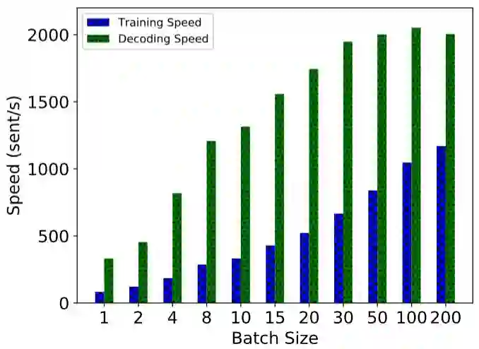 NCRF++的速度表现也非常优异, 在使用全批处理的情况下, 在单个1080 显卡上, 训练速度能到到1000句话每秒,解码速度能达到2000句话每秒。