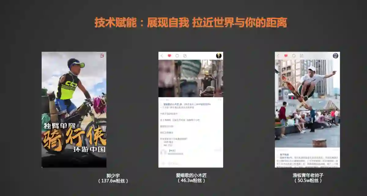 给大家举几个我们怎样通过这几个关键词达到和提升用户幸福感的例子:第一位是我们平台一位叫做郭少宇的用户,他是独臂独腿的90后,1993年的年轻人,今年6月份,他在川藏线318国道用人力骑行了19天的时间,骑了2200公里到达西藏,完成了他人生的梦想,在骑行的过程中,他每天都会通过快手跟他的父母、粉丝们互动,告诉他今天骑了多远,有没有受什么苦,遇到什么困难,怎么克服,尽管他的身体比正常人要弱,但他从意志、体力上带给大家很多的激励,也帮助他在快手上积攒了130多万粉丝。