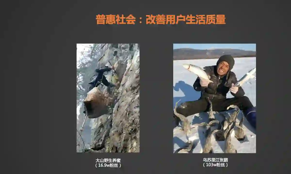 最后还有两个改善用户生活质量的例子:一个是大山野生养蜂人,过去没有多少人人知道蜂蜜怎么产生的,大家原来只是认为蜂蜜只是放在罐子里的糖,其实真正的蜂蜜长在悬崖峭壁,是一份非常危险的工作,这样的一位采蜂蜜的工人,通过快手他可以把蜂蜜卖的更好,因为大家知道蜂蜜是这样产生的时候,就会更加喜欢去买这样的蜂蜜,而不再是一个简简单单的罐头,他卖的蜂蜜变成了一个背后有故事的产品。