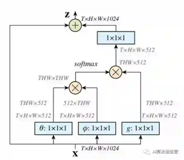 首先对输入的 feature map X 进行线性映射(说白了就是 1*1*1 卷积,来压缩通道数),然后得到 θ,φ,g 特征;
