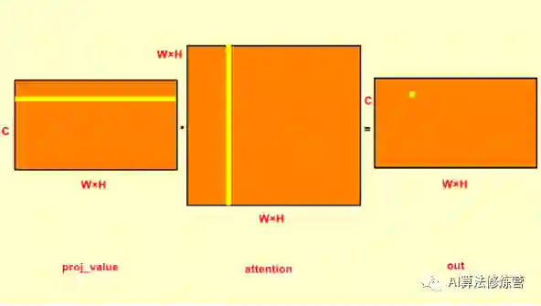 在对proj_value与attention_map点乘之前,先对attention进行转置。这是由于attention中每一行的权重之和为1,是原特征图第j个位置对第i个位置的权重,将其转置之后,每一列之和为1;proj_value的每一行与attention中的每一列点乘,将权重施加于proj_value上,输出为B×C×(W×H)。