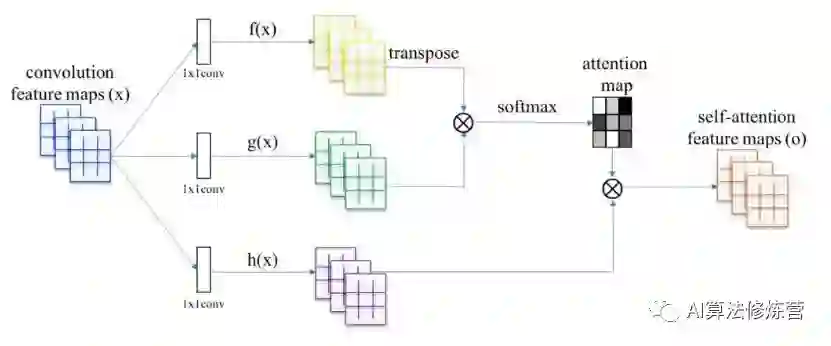 Self-Attention是从NLP中借鉴过来的思想,因此仍然保留了Query, Key和Value等名称。下图是self-attention的基本结构,feature maps是由基本的深度卷积网络得到的特征图,如ResNet、Xception等,这些基本的深度卷积网络被称为backbone,通常将最后ResNet的两个下采样层去除使获得的特征图是原输入图像的1/8大小。