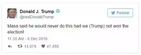 去年12月,日本首富、软银集团CEO孙正义,搞了个1000亿美元的科技基金,并且表示要拿出其中500亿美元投资美国市场,创造五万个就业岗位!当时川普总统惊喜发推特,炫耀道:“正义说啦,要不是洒家赢了选举他才不会给这么多钱呢!”