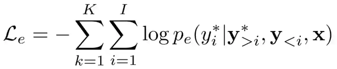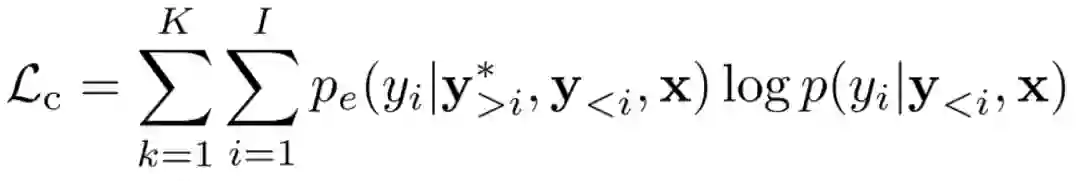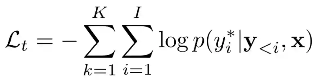 在训练过程中,我们的方法不仅联合训练翻译模块和评估模块,还增加一个额外的 loss 作为对翻译模块的指导。作为翻译模块,它的交叉熵损失为: