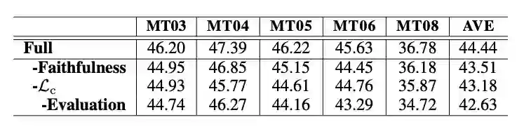 论文提出了一个评估模块来从流利度和忠实度两个方面来评估翻译模块,并指导其生成更优的翻译。实验证明该方法在多个数据集上达到了更好的效果,并且生成了在目标端更流利、对源端更忠实的翻译。