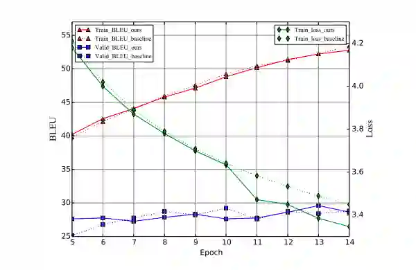 为了证明添加的损失的合理性,论文观察了训练过程中的 Loss 和 BLEU 值,结果表明当模型收敛时,论文方法比基线模型有更高的验证机 BLEU 值和更低的训练 Loss。数据如下: