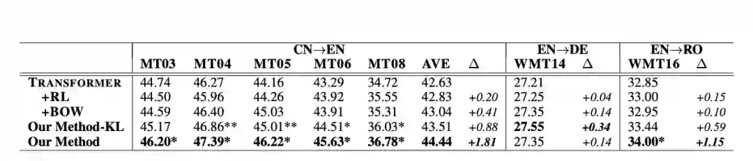 论文在 NIST 中-英、WMT2014 英-德和 WMT2016 英-罗马尼亚上进行了实验,论文与 Transformer 模型、强化学习模型以及词袋模型进行了比较,并实现了将 Kullback-Leibler(KL)散度作为模型额外 loss 的对比系统。主实验结果如下: