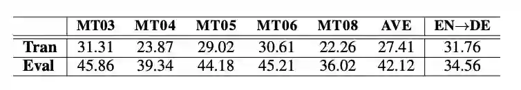 为了证明评估模块有能力指导翻译模块生成更好的翻译,论文将 Ground Truth 作为已知分别输入到两个模块来生成翻译。在 NIST 中-英和 WMT 英-德的两个实验结果表明评估模块比翻译模块的结果有很大优势,这也证实了评估模块有能力指导翻译模块进行翻译。结果如下: