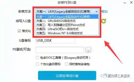 它有多种安装方式,可以直接安装,也可以选择安装系统到U 盘,以后直接启动。