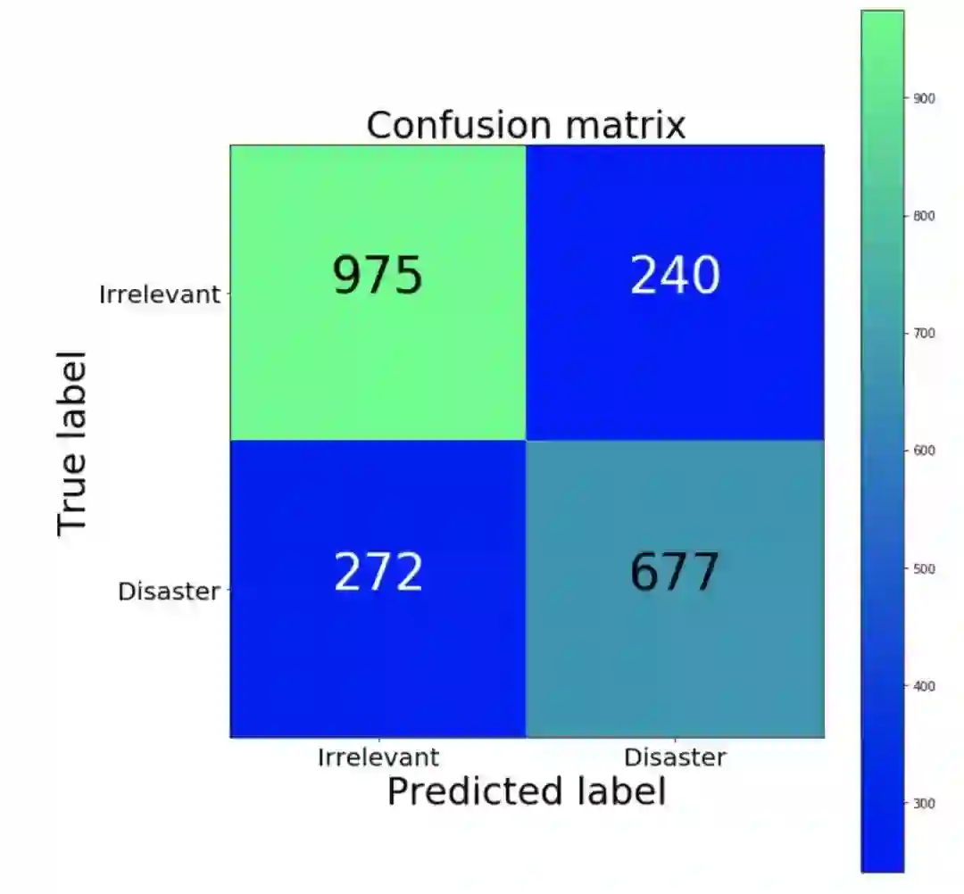 相比假阳性结果,我们的分类器产生了更多的假阴性结果。换句话说,模型中最常见的错误是将灾难性推文错误归类为不相关推文。如果假阳性结果的执法成本很高的话,那么我们分类器的这种偏差就是良性的。