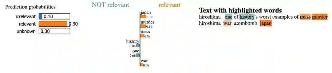 模型能够提取高度相关的词,这意味着它做出了可解释的决定。这些词汇的相关度是最高的,因此我们更愿意在实际生产中部署这样的模型。
