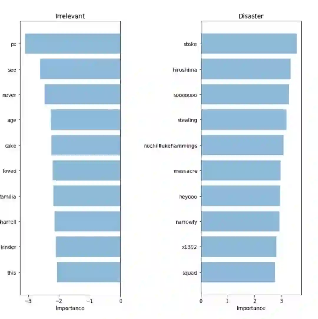 在这里,我们可以用图表来表示灾难性推文与不相关推文两类预测中最重要的词汇。由于我们可以对模型的预测系数进行提取和排序,用词袋模型(bag-of-words)和Logistic回归模型很容易就能计算出单词的重要性。