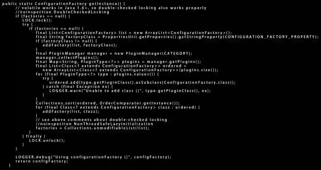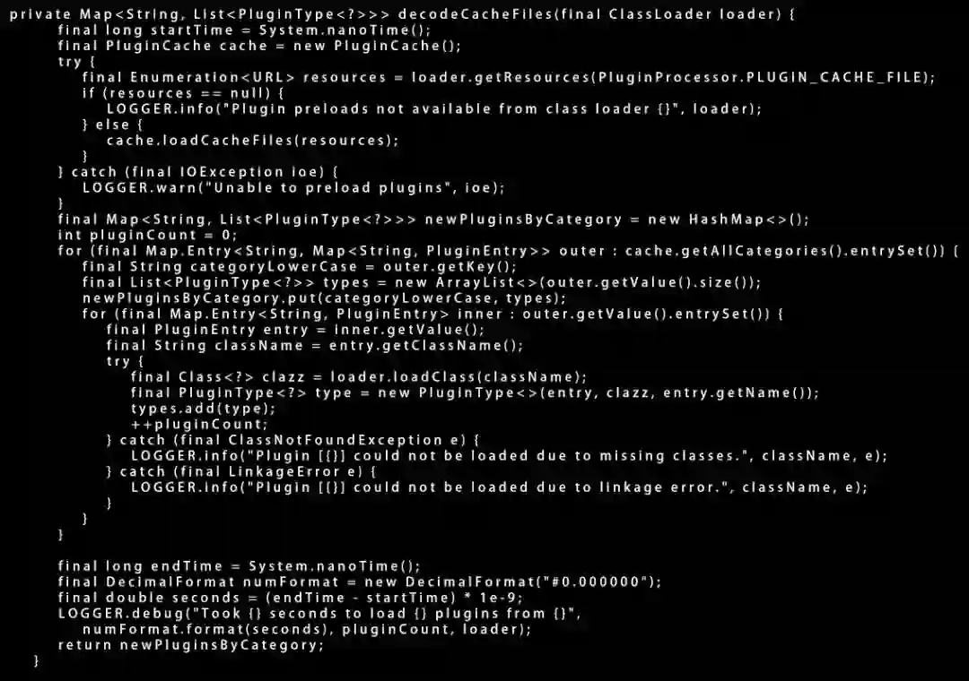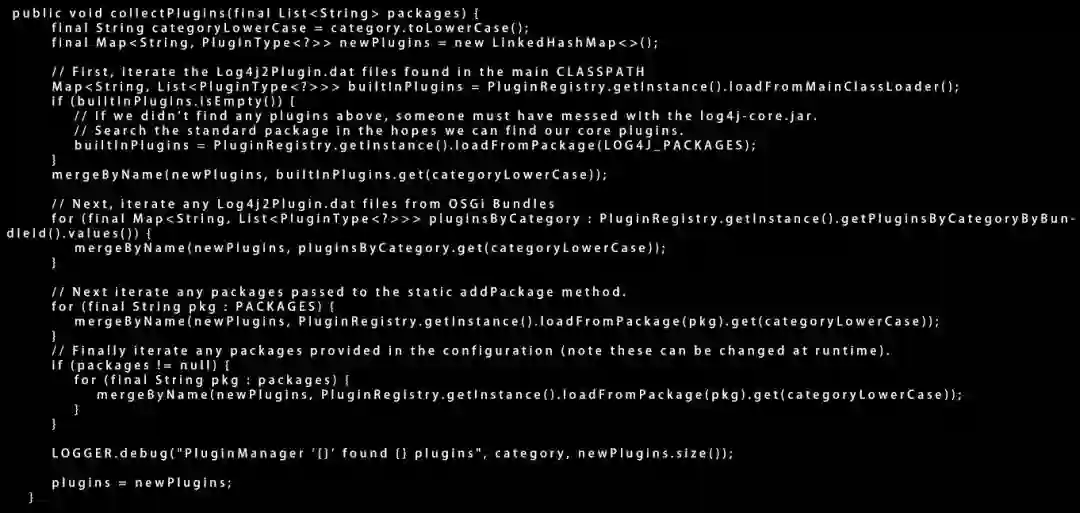 逻辑还是比较简单的,但是我在看源码的时候发现了一个很有意思的东西,就是在加载log4j2 core插件的时候,也就是