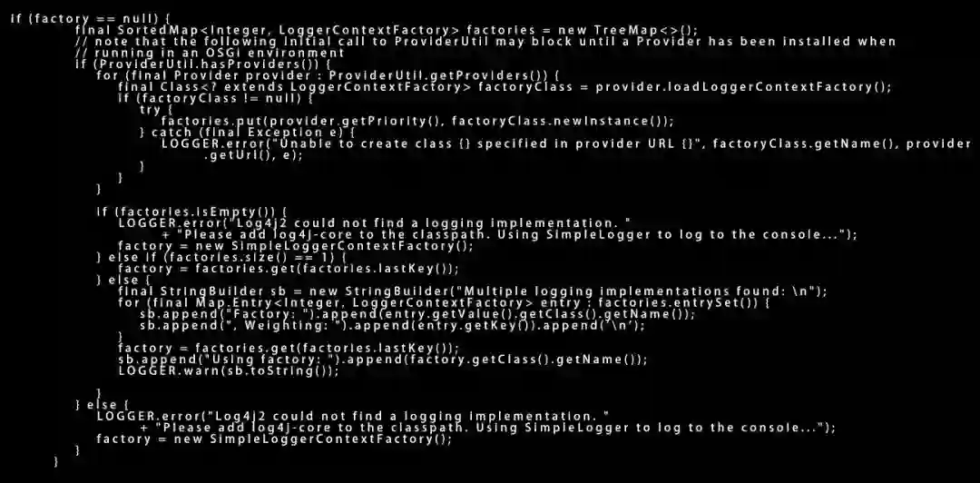 如果没有找到对应的Factory的实现类则通过ProviderUtil中的getProviders()方法载入providers,随后通过provider的loadLoggerContextFactory方法载入LoggerContextFactory的实现类