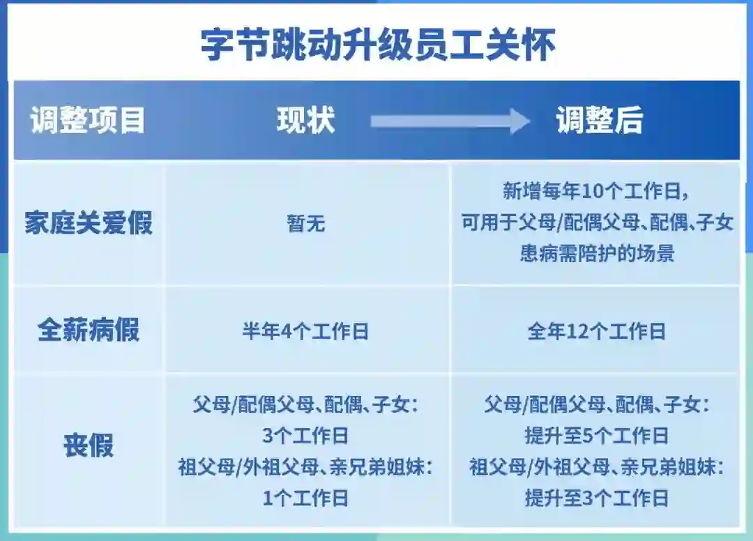 9 月 28 日,字节跳动宣布,升级员工假期及健康福利计划,新增每年 10 天家庭关爱假,可用于家人患病需陪护的场景。此外,员工全薪病假天数由每半年 4 个工作日提升为全年 12 个工作日,并扩展覆盖体检、接种疫苗等场景。丧假天数根据亲属关系,提升至 3 到 5 个工作日。