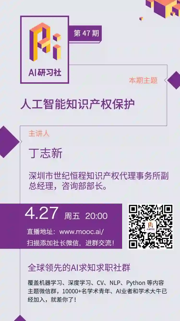 在中美贸易摩擦背景下,知识产权问题成了各方关注的焦点。人工智能的技术领域覆盖甚广,相关的企业、高校研究机构、个人如何进行知识产权保护?尤其是算法、软件编程、大数据、应用领域等等如何得到保护?我国又对职务发明人有哪些优惠政策,法律风险又有哪些?在人工智能领域投资人的机会在哪里?本次公开课,丁志新将结合他十余年的知识产权从业经验,分享解答人工智能的各类知识产权焦点问题。