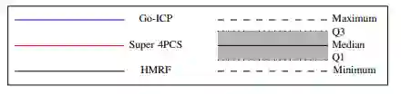 作者通过Go-ICP、Super 4PCS 两种算法与利用HMRF改进的ICP算法(本文算法)进行了性能的对比,总的来说,不管是平移还是旋转错误率还是算法所消耗的时间,HMRF ICP优于另两种算法,其对比图如下: