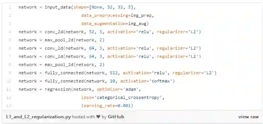 另一个流行的预防过拟合的方式是在每一层中运用L1 或L2 正则方程。