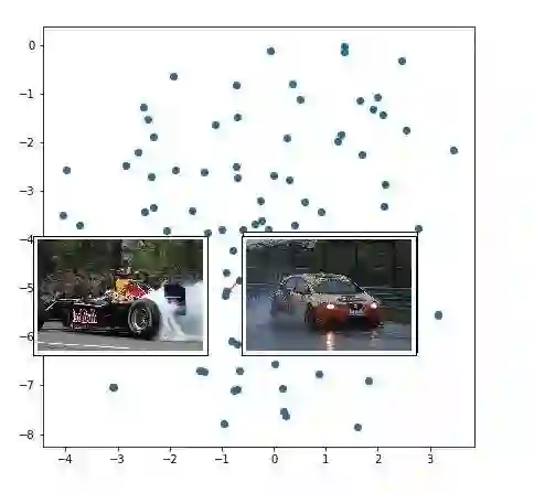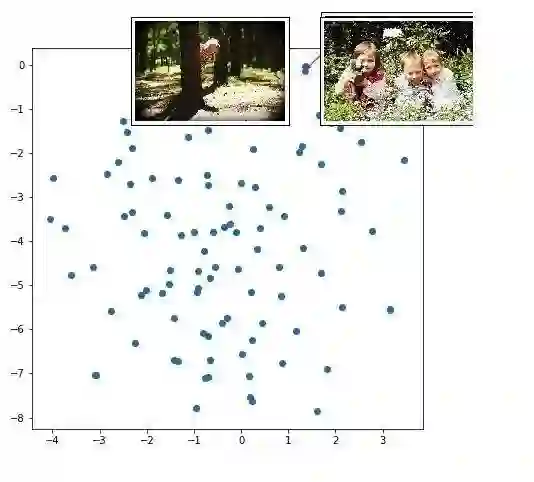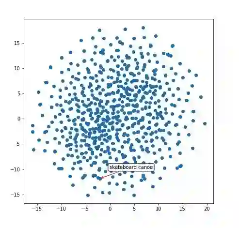 如果词表示将类似的单词聚类在一起,那么图像表示(Inception支持的图像编码器输出)呢?我将相同的 t-SNE 技术应用于图像表示(在图说解码器的第一步中作为输入的 300 维度的张量)。