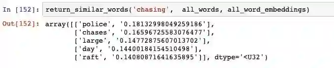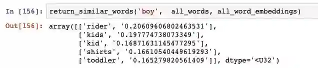 我们可以使用 100 维表示来构建一个函数,该函数可找出与输入单词最相似的单词。它的工作原理很简单:采用 100 维的表示,并找出它与数据库中所有其他单词的余弦相似度。