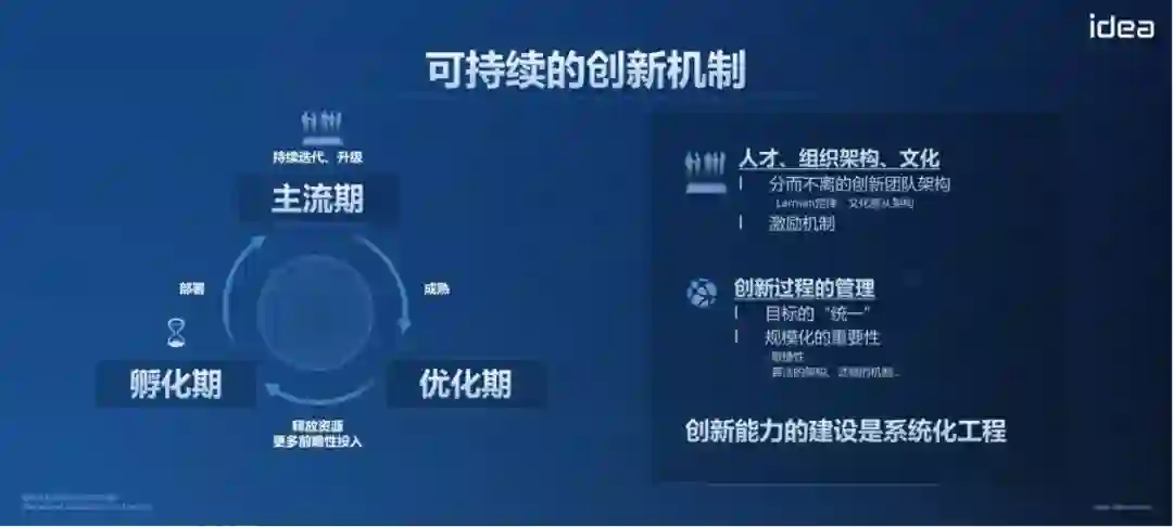 建设「创新能力」过程中一个至关重要的环节,就是如何培育出持续不断的新产品、新技术。(上图左图)新技术和新产品的生命周期基本上都经过「孵化期」,「主流期」和「优化期」这三个阶段。能让这个闭环源源不断的持续进行,有几点至关重要: