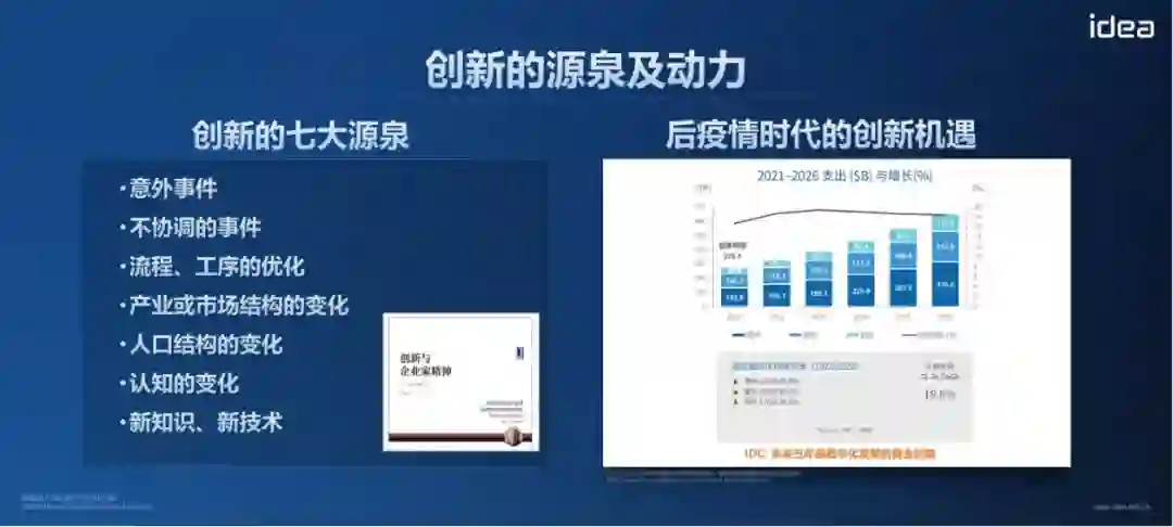 在建设「创新能力」的过程中,最重要的两点是创新来源、创新过程的管理和优化。创新的源泉怎么来?当中有很多方法论,在此分享一本经典著作《创新与企业家精神》,书中阐述了创新的七大源泉(如下图左图),书中也给出了很多经典的实例。