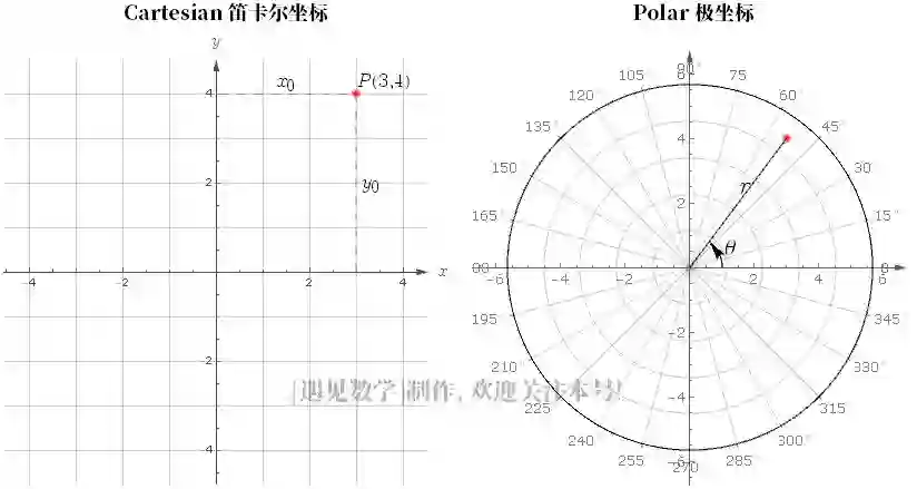 这些新坐标称为极坐标,之所以这么命名,是因为我们将轴的交叉点视为所有事物从中辐射出来的极点(见上图)。