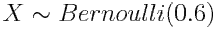 上式表示随机变量 X 服从成功率(正面向上)为 0.6 的伯努利分布。