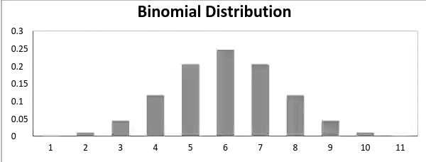 而成功概率和失败概率相等的二项分布看起来如下图所示:
