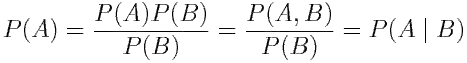 如果我们从右到左阅读上式,我们会发现 P(A | B) = P(A)。这就意味着事件 A 独立于事件 B!P(B)也是一样,独立事件的解释就是这样。