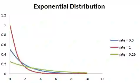 其中 λ >0 为概率密度函数的参数。随机变量 X 服从于指数分布,则该变量的均值可表示为 E(X) = 1/λ、方差可以表示为 Var(X) = (1/λ)^2。如下图所示,若λ较大,则指数分布的曲线下降地更大,若λ较小,则曲线越平坦。如下图所示: