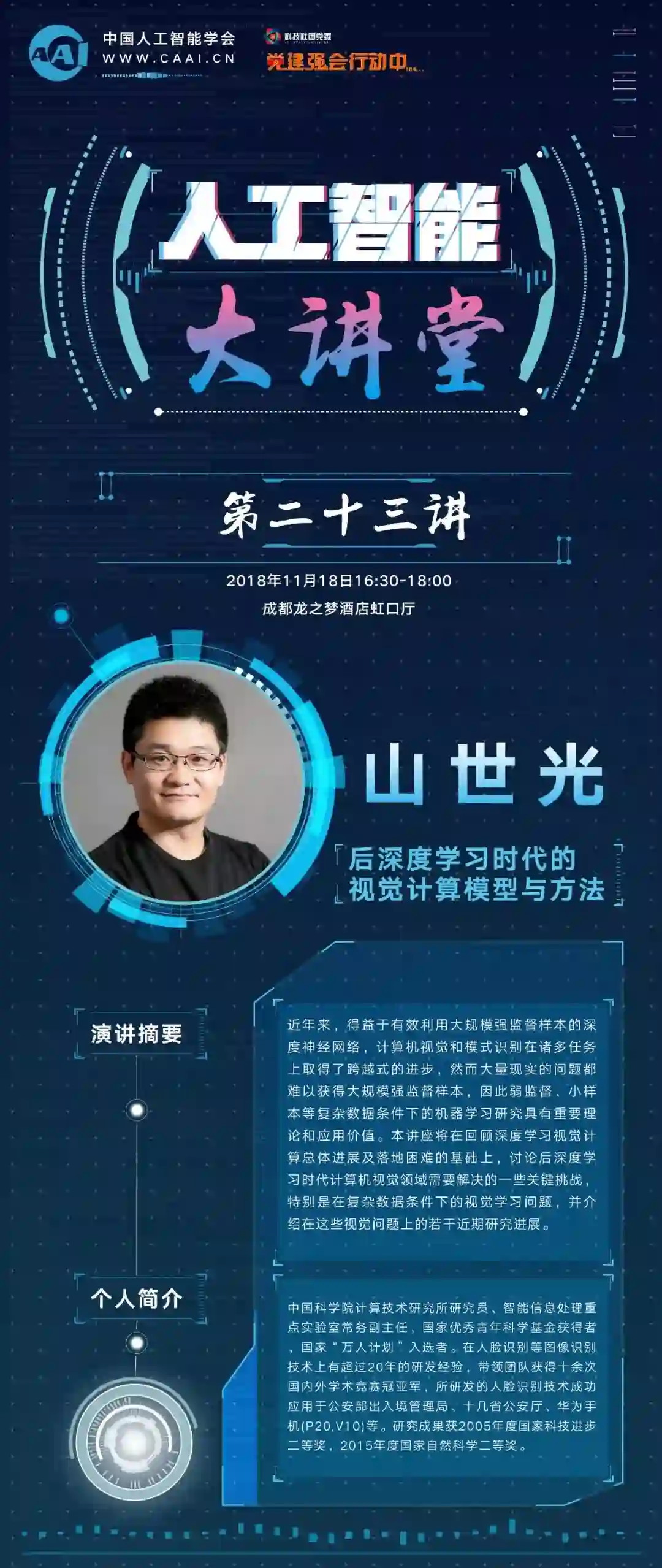 第三场将由中国科学院计算技术研究所研究员、智能信息处理重点实验室常务副主任,国家优秀青年科学基金获得者山世光带来题为《后深度学习时代的视觉计算模型与方法》的报告。