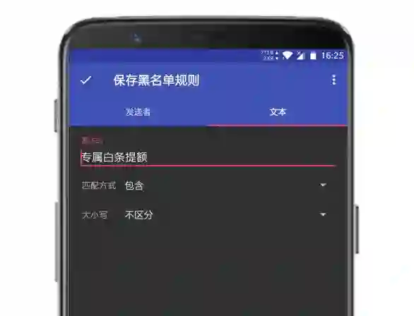 NekoSMS 拥有黑名单、白名单功能,并且上手十分简单,即使不会正则表达式,我们也可以选择其它的匹配方式,如上图的专属提额短信,我们只需新建黑名单规则,选择「文本」,「匹配方式」选择「包含」,表达式输入「专属白条提额」,保存一下即可(当然方法不唯一,匹配方式可以选择其他类型)。
