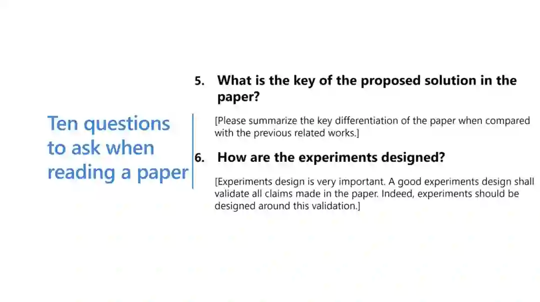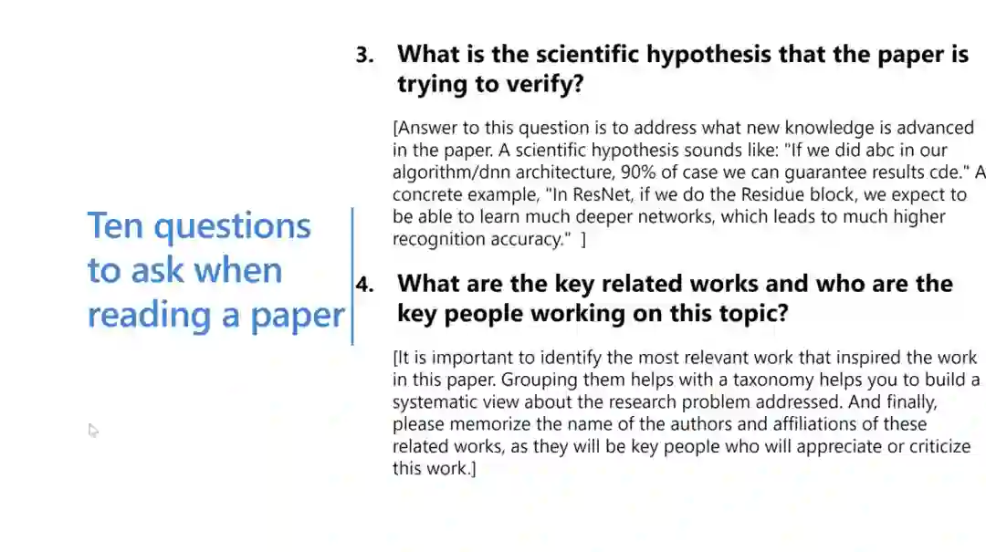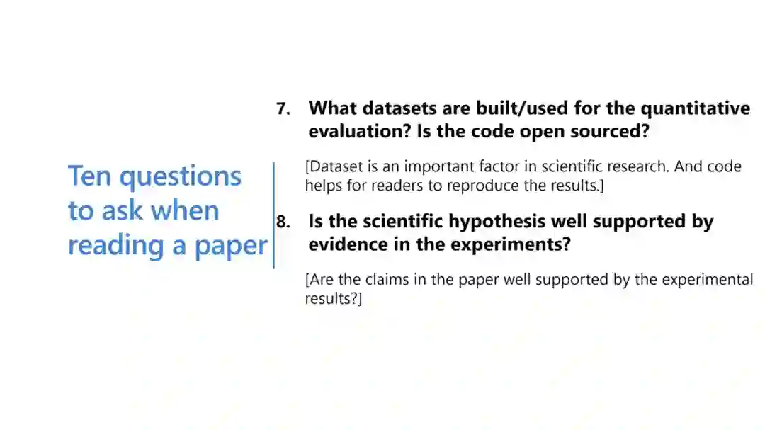 相应地,读者在读论文的时候也应该要有逻辑,首先要清楚论文中的表达是否是我想要学习到的;其次,我能从论文中学到多少,能不能找到新的方向与新的课题初稿;最后,这篇论文的背景是什么——是什么样的背景让这篇论文变得重要和有趣。