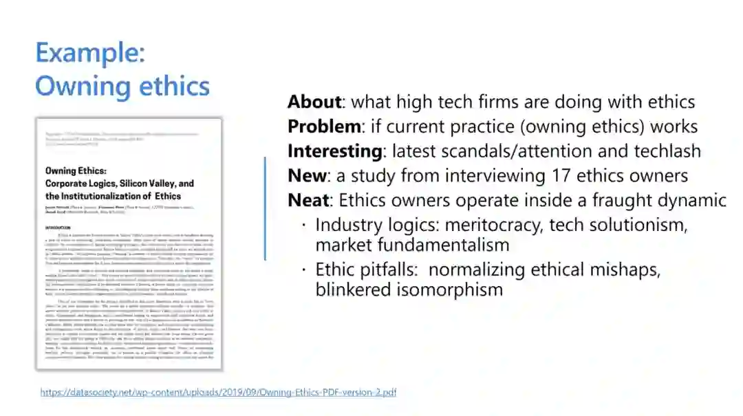 如何读论文的引言?举个例子,我最近在读《拥有伦理学:企业逻辑、硅谷与伦理学的制度化》(Owning Ethics:Corporate Logics, Silicon Valley, and the Institutionalization of Ethics),在引言部分,我问了 Kajiya 提出的那几个问题。首先这篇论文讲的是高科技公司在道德方面做了什么;其次,解决的问题是现在的实践(拥有道德)做法;文章的迷人之处在于最近的丑闻和技术后冲(techlash);这篇文章的最新之处是对 17 位科技公司的“道德拥有者”进行了采访;最后,论文的神奇之处是得出了结论:道德所有者在令人担忧的动态中运营公司。