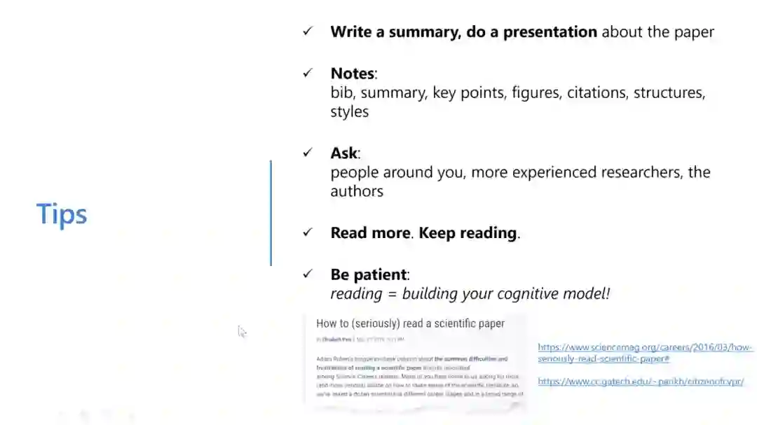 最后,我想向大家介绍几个小tips。我最想强调的是要养成写小总结的习惯,最好能做报告,这样真的能够增加你对所读论文的理解。我想再次强调,大家一定要有耐心,因为阅读就是在你大脑中建立认知模型的过程,虽然不知道今天读的文章未来什么时候能够派上用场,但是请大家保持阅读、建立认知的习惯。