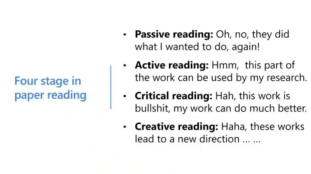 如同前面沈老师所说的,读 paper 可以分为四个阶段:消极阅读、积极阅读、批判性阅读和创造性阅读。