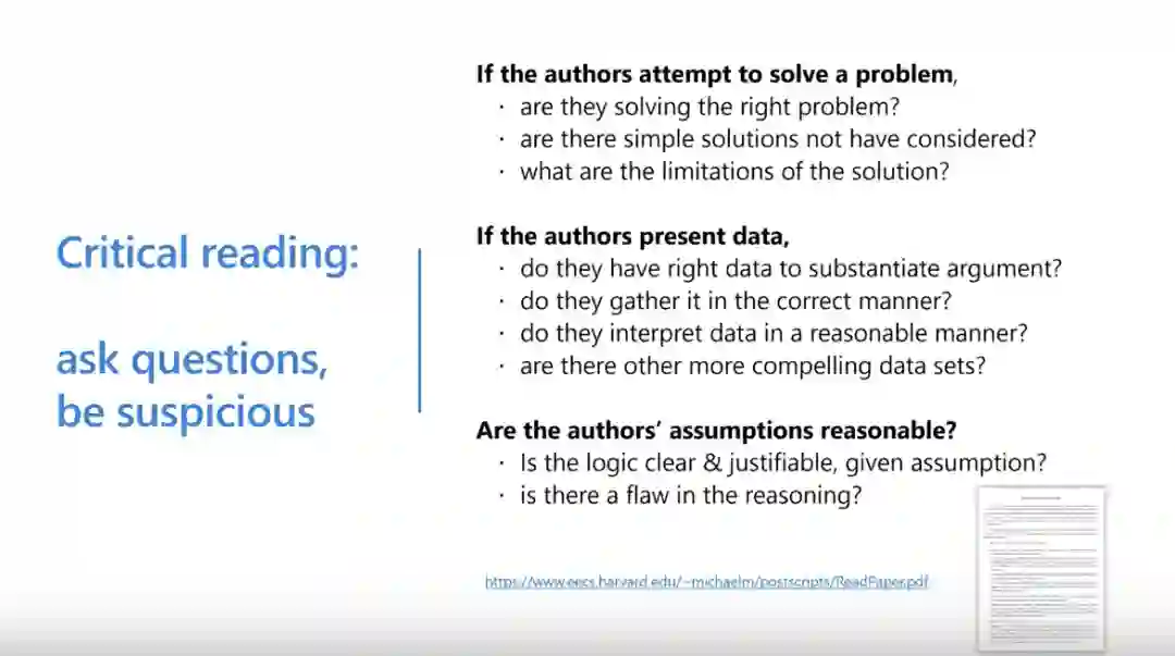 以批判性阅读开始,带着质疑的心态问问题。如果作者论文中声称解决了一个问题,那么你就要在心里问自己:论文是否正确、真正地解决了问题?作者论文中所用方法是否有局限性?如果所读的论文没有解决问题,那么我能解决么?我能采用比论文中更简单的方法解决么?所以,一旦进入仔细阅读的状态,要在读论文之前对自己说:这篇论文可能有问题,我要找出来。这就是批判性阅读。