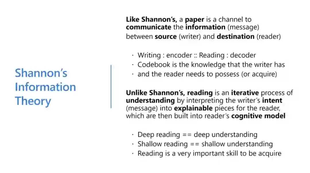 实际上,这种关系可以用香侬的信息论原理来解释——论文是作者和读者之间交流信息的渠道,主要是单向传输,信息源是作者,而目的地就是读者。写作就像编码,阅读就像解码,所以我们需要一本 Codebook 来介绍“编码”到“解码”所需要的知识,也即作者按照这本 Codebook 中的规范进行“编码”,阅读者则用它来“解码”。