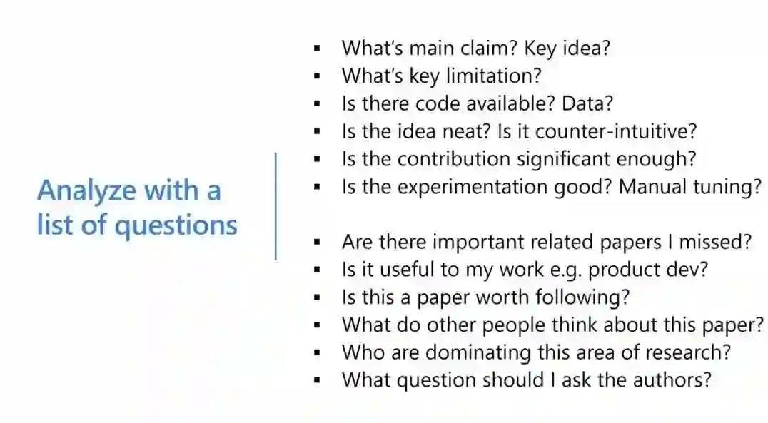 我一直觉得理解了一个东西以后,最重要的是能够自问自答,这张图片是一个总结(图片不见啦?),图片的上半部分是比较客观的问题,包括论文的核心观点是什么?主要的局限性是什么?代码和数据是不是可得的?论文的贡献是否有意义?论文中的实验是否足够好?图片的下半部分是比较主观的问题,包括我错过了什么相关论文么?这对我的工作有何帮助么?这是一篇值得关注的论文么?这个研究领域的领头人是谁呢?哪些公司、研究院、实验室值得关注?其他的人对这篇论文有何看法呢?如果有机会见到作者,我应该问作者什么问题?当你在阅读论文的时候如果能回答出上面列出的问题,我相信你会对你所读论文有非常深刻的理解。