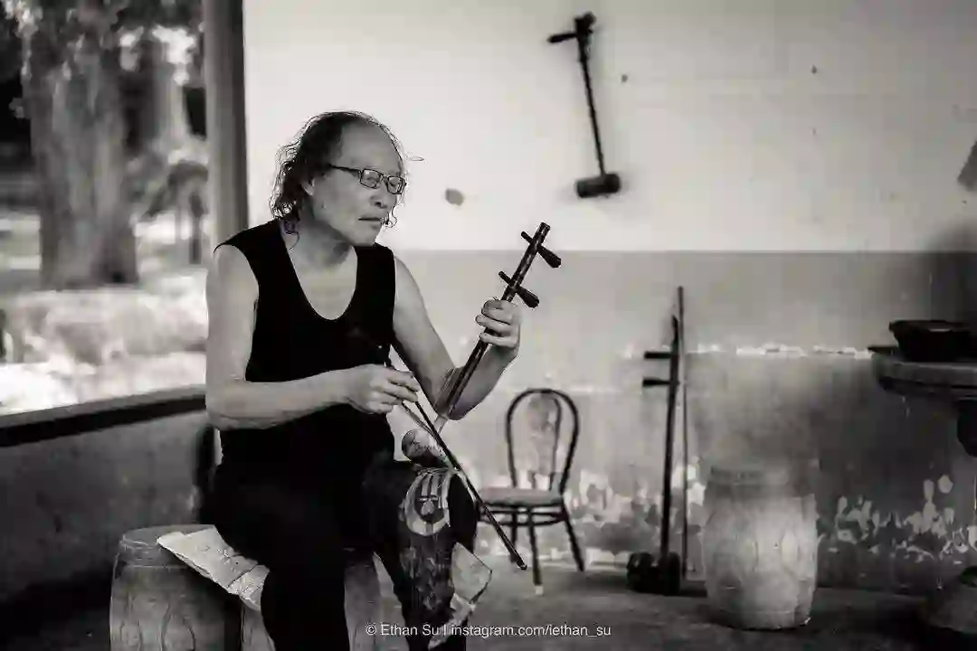 在一座挂着“保护文物,请熄灭手中香烟”横幅的主题长廊里,几个爷爷分别拿着三弦、胡琴和二胡坐在一角,刚弹完铡美案又接着拉白毛女,紧接着又有人点了一首智取威虎山,这里既是KTV,也是一场不插电的现场乐队live,声音能传多远凭的是积淀。