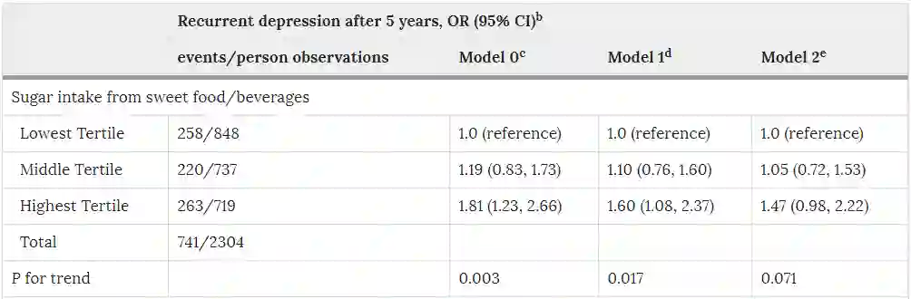 从甜食或饮料中摄入的糖分与5年后复发性抑郁的联系。